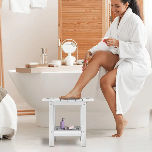 HDPE Shower Stool with 2-Tier Storage Shelf – Waterproof Bath Bench with Shower Head Slot & Handle – Durable & Senior-Friendly